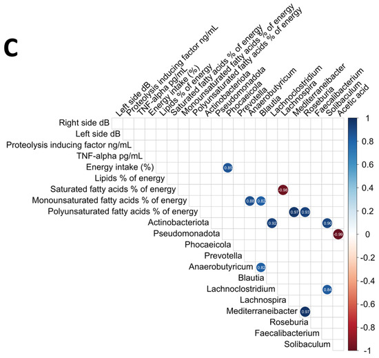 Correlations between the intestinal microbiome, nutritional status, electrical taste perception, and inflammatory cytokines. (A) DMB 150 mg (standard dose), (B) DMB 300 mg (high dose), and (C) placebo.