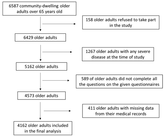 Initially, 6587 community-dwelling adults aged above 65 years old were arbitrarily enrolled from 10 different Greek regions, including both urban and rural regions. The 10 different regions comprised Athens, Thessaloniki, Alexandroupoli, Larissa, Ioannina, Patra, Kalamata, Crete and the North and South Aegean. Enrollment to the survey was conducted between April 2018 and October 2019 in community-dwelling elderly people concerning the pre-COVID-19 period. The enrollment to the study for the post-COVID-19 period was begun after February 2022 and lasted until June 2023. The enrolled elderly people were mostly recruited when they visited hospitals for routine check-ups and in municipal care units in which entertainment events for the elderly took place. Several older adults were also enrolled during visits for nutritional support and counselling with nutritionists and dietitians from our research group, as well as during visits to nutritionists and dietitians who collaborated with our research group. A detailed depiction of the study enrolment as a flow chart diagram is shown in Figure 1. Among the 6587 community-dwelling older adults, 158 declined to take part in the study and 1267 were diagnosed with a severe disease during the study. Moreover, 589 of the initially recruited older adults did not complete all the questions on the given questionnaires, while for 411 participants there was missing data from their medical records. Finally, 4162 older adults were included in the final evaluation by utilizing the relevant exclusion and inclusion criteria, leading to a final response rate of 63.2%.