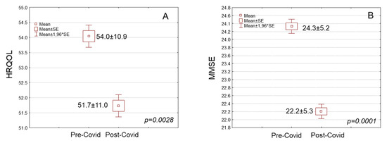 (A) Health-related quality of life (HRQOL) score and (B) Mini Menta State Examination (MMSE) score of the study population in pre- and post-Covid periods.