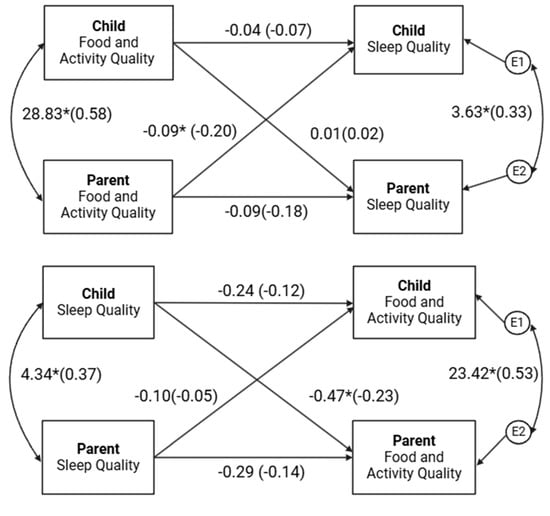 Actor–Partner Interdependence Models. Note: The results display the dyadic bi-directional associations between parents’ and children’s sleep quality and food and activity quality. Models were estimated using actor–partner interdependence models, which account for actor effects (associations between an individual’s own variables) and partner effects (associations between one dyad member’s variable and the other member’s variable). Higher sleep quality scores suggest worse sleep quality. * p < 0.05.
