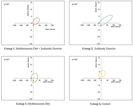 Statistical analysis: For continuous variables, the results were presented in mean ± standard deviation, or P50 (P25, P75), depending on the normality of distribution according to the Shapiro–Wilk test. Percentage (%) of change of variance and 95% confidence interval (95%CI) were also provided). Likewise, categorical variables were resumed as n (%). Inferential analyses to evaluate the baseline data were performed either by ANOVA or Kruskal–Wallis tests according to the normality of distribution. The Chi-square test was used to compare categorical variables. After the intervention, the Wilcoxon test and Kruskal–Wallis (with the U-Mann–Whitney U test using the Bonferroni correction if applied) were performed to compare intra- and inter-group differences, respectively. Hotelling’s T2 test was used to evaluate the changes in BIVA vectors (resistance and reactance) in each group. The effect size for continuous variables was estimated by the Cohen D test using the software G*Power® [12]. A p-value of <0.05 was considered statistically significant.