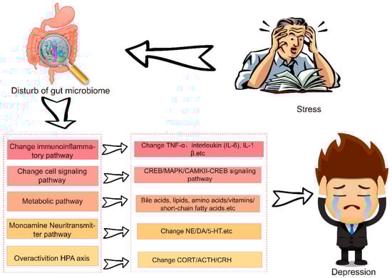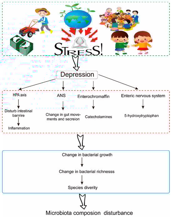 Depression is in connection with changes in the composition of gut microorganisms [24]. Pressure has been shown to cause an imbalance of human gut microbiota, leading to mental health problems like anxiety and depression [25,26]. The onsets of depression-like moods have been shown to change the structure and number of intestinal flora. Additionally, anxiety and depression are often accompanied by altering colonic motility, resulting in the composition and stability of gut microbiota being disrupted and changes in gut ecology and morphology. Research has indicated that chronic unpredictable mild stress (CUMS) treatment altered the diversity and composition of intestinal flora and increased the intestinal epithelium’s permeability, suggesting a defect happened in the intestinal barrier [17]. The disruption of mucosal barrier integrity induced by CUMS is linked to reduce the concentration of tight junction protein occludin-1 and impaired mucosal layer function due to reductions in goblet cell activity. The onset of depression and anxiety has a significant impact on the microbial community’s composition within the colon. It indicates such changes are triggered by heightened activation of the stress response, alongside disruptions to the microbial environment resulting from variations in colonic motility [27].