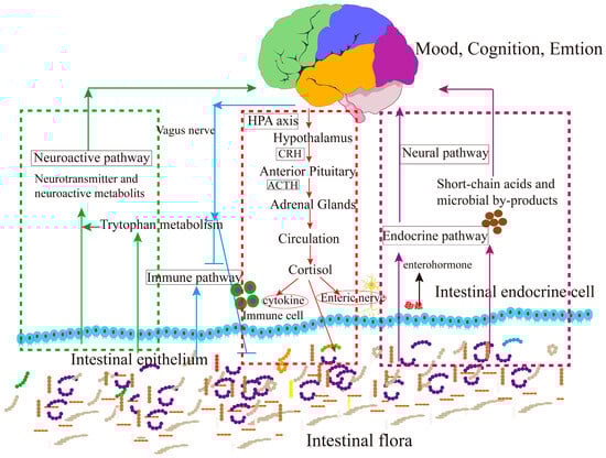 The interaction between gut flora and the brain. Arrow in green indicates the neuroactive pathway; arrow in blue indicates the immune pathway; arrow in red indicates the HPA axis; arrow in purple indicates the metabolic pathway.
