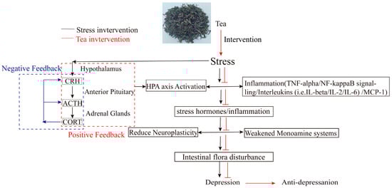 Tea, containing bioactive ingredients, like tea polyphenols, L-theanine, flavonoids, etc., exerts positive influences on inflammation, metabolism, and the endocrine system, potentially reducing the risk of depression. Mechanistic studies, including animal models, epidemiological studies, and human intervention trials, suggest that tea compounds, such as L-theanine, catechins, and tea pigments, flavonoids, may help prevent or treat depression. These effects are mediated through mechanisms such as inhibiting the activation of the HPA, regulating inflammation, promoting neurogenesis and neuroplasticity, modulating the weakened monoamine system, and improving gut microbiota disturbances (Figure 4) [79,80,81]. Specifically, regular consumption of green tea [82], jasmine flower tea [83,84], and ripened pu-erh tea [85], has been shown to reduce the risk of depression, likely due to their ability to restore intestinal homeostasis [86].