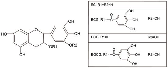 There are four important polyphenols in green tea, which are classified as catechins, including epicatechin (EC), epicatechin (EGC), epicatechin-3-gallate (ECG), and epicatechin-3-gallate (EGCG) (Figure 5). EGCG, which is the main catechins of tea polyphenol and reach to 10–15% [106], has a variety of physiological activities, such as anti-oxidation [107], anti-tumor [108], anti-aging [109], anti-depression [110] and so on.