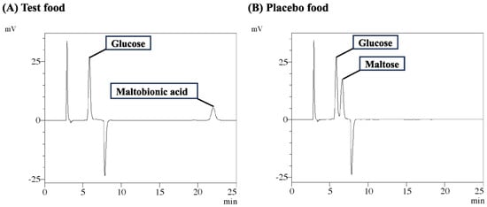 The intervention involved tablets containing calcium maltobionate (San-ei Sucrochemical Co., Ltd., Chita, Japan), prepared by the action of glucose oxidase on maltose. Each tablet contained 1.100 g (1.045 g as maltobionic acid) per 5 g of tablets and was used as the test food. Placebo tablets had the same composition, except that calcium maltobionate was substituted with a mixture of maltose and calcium carbonate. The formulations and daily nutritional compositions of both the test and placebo foods are shown in Table 1. The chromatograms and analytical conditions for the test and placebo foods are shown in Figure 1.