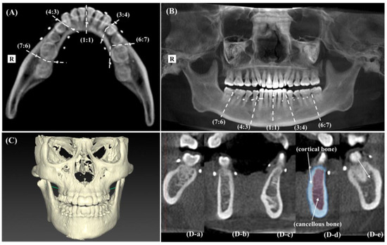During the screening examination, study participants received a mouthpiece (2.3 mm thick) made of vinyl ethylene acetate after obtaining an impression of the entire mandible, including the mandibular second molar, using a silicone impression material (FUSION II, GC Corporation, Tokyo, Japan). The mouthpiece was fitted into each participant’s mandible. Five sites were marked with 1.5 mm hemispherical gutta-percha points on both the labial and lingual sides: between the right second molar and right first molar (7-6), between the right first premolar and right canine (4-3), between the right and left central incisors (1-1), between the left canine and left first premolar (3-4), and between the left first molar and left second molar (6-7). For computed tomography (CT) imaging, the mouthpiece remained attached to the mandible, and a dental CT imaging device (KaVo 3D eXam, KaVo, Dental Systems, Biberach, Germany) was used to capture images from the mental to the orbital region in panoramic CT mode (70 kV, 6 mA, 17.8 s, caliber 23 cm, and height 17 cm) both before and 24 weeks after intervention.