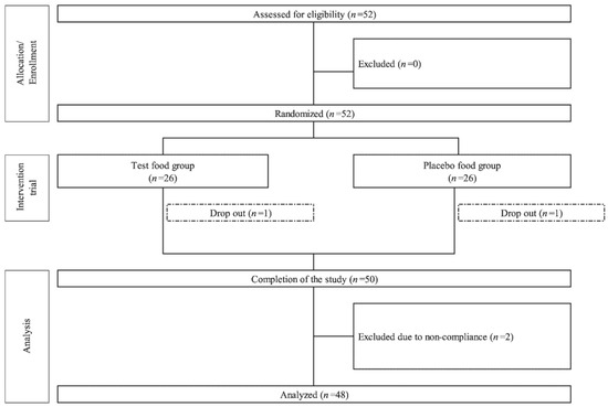 The 52 eligible participants were divided into the test or placebo food group, with 26 participants in each group. Similar distributions of age, menopausal status, and YAM values of the right calcaneus were ensured across both groups. Randomization was conducted by the allocation manager using randMS (FileMaker, Inc., Cupertino, CA, USA) based on provided identification numbers. The allocation ratio for both groups was 1:1. Participants, outcome assessors, and other study personnel were blinded to group assignments throughout the study and were not involved in the allocation process.