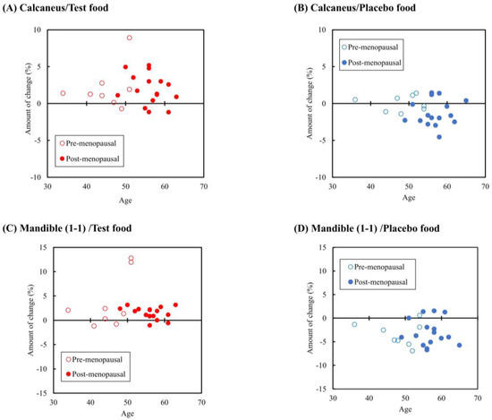 Age correlations for the amount of bone mineral density change in the calcaneus and mandible. The above figure shows the correlations between pre- and post-intervention changes in the calcaneal speed of sound (SOS) value and mandibular (1-1) Hounsfield unit (HU) value in relation to study participant age. (A) The correlation between the percentage change in the calcaneal SOS value and age in the test food group; (B) the correlation between the calcaneal SOS value and age in the placebo food group; (C) the correlation between the percentage change in the HU value of the mandible (1-1) and age in the test food group; (D) the correlation between the percentage change in the HU value of the mandible (1-1) and age in the placebo food group.