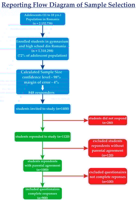 The questionnaire was completed voluntarily and anonymously during the school year 2023–2024 (September 2023–June 2024), and it included a sample of 900 students from different schools, both in rural and urban areas, from the larger part of Romania, (North-West regions). All the questionnaires that were incomplete and without parental consent were excluded.