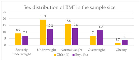 We calculated the BMI of the adolescents and stratified the sample depending on the classes of obesity with WHO cut-off points for adolescents—severely underweight, underweight, normal weight, overweight and obese [45]. The study results showed that 28.2% (n = 254) of girls were underweight, and only 8.7% were overweight or obese. Regarding the boys, almost 20% were underweight (n = 174), and only 15.2% corresponded to the overweight or obese class; the rest of them had a normal weight (Figure 2).