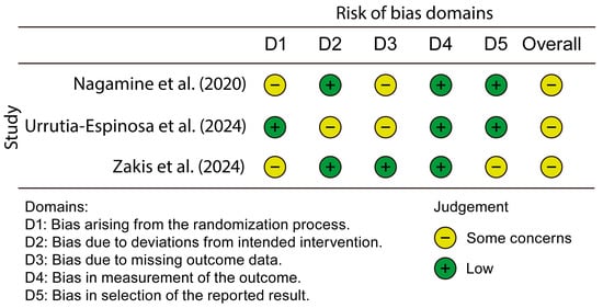- Sterne, J.A.C.; Savović, J.; Page, M.J.; Elbers, R.G.; Blencowe, N.S.; Boutron, I.; Cates, C.J.; Cheng, H.-Y.; Corbett, M.S.; Eldridge, S.M.; et al. RoB 2: A revised tool for assessing risk of bias in randomised trials. BMJ 2019, 366, l4898. [Google Scholar] [CrossRef] [PubMed]