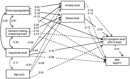 Regarding the differences by sex, our study showed invariance for the SEM. This result seems inconsistent with previous studies which observed differences between men and women in most of the variables analyzed in this work (female sex were related to higher impulsivity levels, more perceived stress, more difficulties in decision-making, and higher severity of ED) [59,60,76,77,78]. Regarding this supposed discrepancy, it should be considered that our study did not analyze mean differences between men and women in these constructs, but rather assessed whether the underlying relationships (the structural coefficients) were similar. For example, our objective was not to identify differences in the symptom levels of ED between the sexes, but to test the contribution of the severity of ED on BMI (measuring the direct and indirect effects).