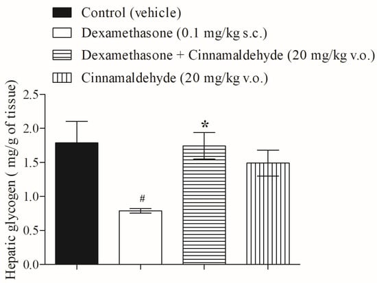 Action of CIN on hepatic glycogen accumulation in insulin-resistant rats, after 5 days of in vivo treatment. N = 5, # p ≤ 0.05 compared with control (vehicle); * p ≤ 0.05 compared with the dexamethasone group.