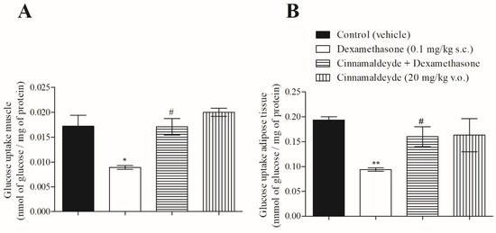 To evaluate the action of CIN on glucose uptake in skeletal muscle tissue and epididymal adipose tissue, tissues were collected from rats induced to insulin resistance and treated with dexamethasone and with CIN for 5 days. After the dissection and fragmentation of the respective tissues, they were preincubated (30 min) and then incubated (60 min) and total protein was quantified [12]. The glucose uptake results are expressed as nmol glucose/mg of protein. 14C-DG was measured in a liquid scintillator spectrometer (model LS 6500; Multi-Purpose Scintillation Counter-Beckman, Boston, MA, USA).