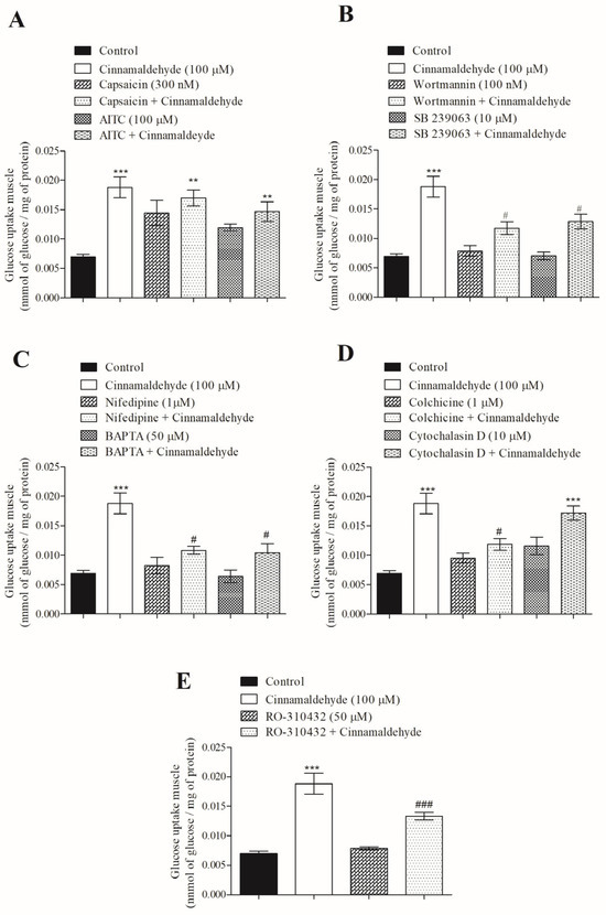Slices of soleus muscle from normoglycaemic rats were allocated to the control and treated groups (four slices for each group). The muscles were dissected, preincubated (30 min) and then incubated (60 min) at 37 °C in O2/CO2 (95%: 5%, v/v), with pH 7.4 in Krebs Ringer-bicarbonate buffer (KRb) without (control) or with CIN (100 μM CIN). CIN was added to the incubation medium (60 min) in the presence or absence of 300 nM of capsaiscin, 100 µM of alil-isotiocianato (AITC), 100 nM of wortmannin, 10 µM of SB239063, 1 µM of Nifedipine, 50 µM of BAPTA-AM, 1 µM of colchicine, 10 µM of chytocalasin and 50 µM of RO-310432. 14C-DG (0.1 μCi/mL; 0.12 nM) was added to all samples throughout the incubation period, The glucose uptake results are expressed as nmol glucose/mg of protein. 14C-DG was measured in a liquid scintillator spectrometer (model LS 6500; Multi-Purpose Scintillation Counter-Beckman, Boston, MA, USA).