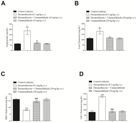 Effect of CIN on (A) triglycerides, (B) total cholesterol, (C) HDL cholesterol and (D) LDL cholesterol in insulin-resistant rats after 5 days of treatment with dexamethasone. N = 6 for each group. *** p ≤ 0.001; ** p ≤ 0.01 and * p ≤ 0.05, compared to the control group. ### p ≤ 0.001; ## p ≤ 0.01 and # p ≤ 0.05, compared to the dexamethasone group.