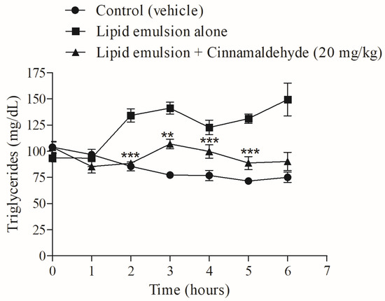 Acute effect of CIN on the oral triglyceride tolerance test in normal rats overloaded with an enriched lipid emulsion, at 0 to 6 h. N = 6. *** p ≤ 0.001 and ** p ≤ 0.01, compared to the respective value for the lipid emulsion group.