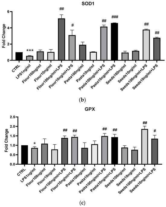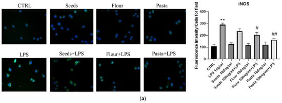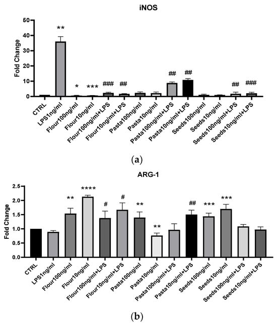 3.5. M1–M2 Polarization Markers Expression Following Incubation of BV2 Cells with Seeds, Flower, Pasta Extracts, and LPS Treatment