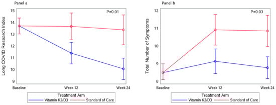 In time-varying adjusted models (Table 2), the mean difference in the LC Research Index was 3.2 points lower in the vitamin K2/D3 arm compared to the SOC arm (p = 0.04), and female sex had an LC Research Index 2.4 higher (p = 0.04) compared to that of male sex. In Table 3, the vitamin K2/D3 arm had nearly two less total number of LC symptoms [−1.7 (−3.2, −0.1); p = 0.02] compared to the SOC arm. In Table 3, non-white race had a 2.4 times higher number of LC symptoms compared to white race (p = 0.01), and improvement in gut permeability (↓ Zonulin) was associated (p = 0.02) with a reduction in the total number of LC symptoms.
