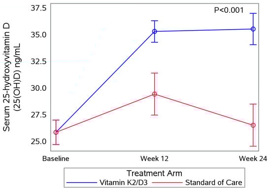 In univariate models, the average serum 25(OH)D increase over six-months was 10.7 mg/dL and the proportion with serum 25(H)D < 20 ng/mL levels decreased 12.6% in the vitamin K2/D3 arm. Among the SOC arm, the proportion with serum 25(OH)D levels < 20 ng/mL increased by 3.8% at 24 weeks. Overall, the estimated rate of change in 25(OH)D over time (Figure 3) was greater among the vitamin K2/D3 arm compared to the SOC arm (p < 0.0001).