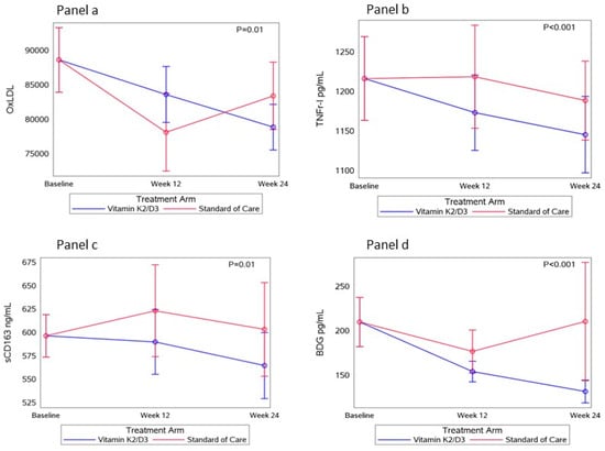Reductions in oxidized LDL, sTNF-RI, sCD163, and the fungal translocation marker (1,3)-β-d-glucan (BDG) were observed in the vitamin K2/D3 arm compared to the SOC arm (p < 0.01) over 24 weeks (Figure 4). In the vitamin K2/D3 arm, the mean oxLDL decreased by 9148.0 ± 28,445.7 mU/L [vs. SOC (−6633.4 ± 3400.9); p = 0.001], sTNF-RI decreased by 106.3 ± 239.0 pg/mL [vs. SOC (−91.9 ± 244.4); p = 0.01], sCD163 decreased by 50.4 ± 145.4 ng/mL [vs. SOC (−9.1 ± 376.3); p = 0.02], and BDG decreased by 40.3 ± 115.8 pg/mL [vs. SOC (−15.8 ± 284.2); p = 0.03].