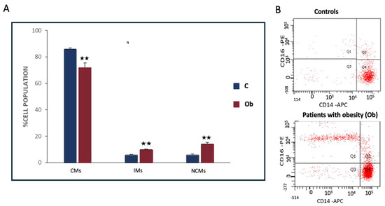 (A,B) Differences in circulating monocyte subsets between individuals with obesity without dietary restrictions (Ob) and typical-weight controls (N). (A) The percentages of classical monocytes (CMs: CD14+CD16−), non-classical monocytes (NCMs: CD14dimCD16+), and intermediate monocytes (IMs: CD14+CD16++) are shown as a proportion of total CD14+ cells (mean ± SD). (B) Representative flow cytometry plots illustrating the expression of CD14 and CD16 in both N and Ob groups. Group comparisons were made using one-way ANOVA. ⋆⋆: p < 0.001.