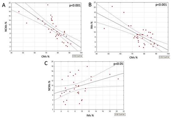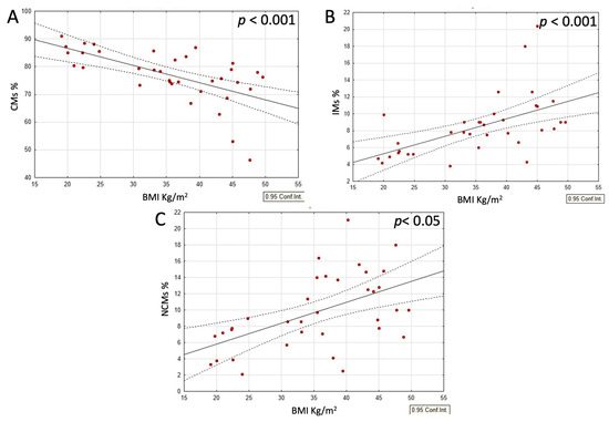 When analyzing the combined group of typical-weight individuals and those with obesity, with and without dietary interventions, a strong negative correlation was observed between the CM and both the IM and NCM populations. In contrast, the IM and NCM populations positively correlated with each other (Figure 2A–C). Moreover, within this same group, both the IM and NCM populations positively correlated with BMI and CRP levels, while the CM populations demonstrated a negative correlation with these parameters (Figure 3A–C and Figure 4A–C).