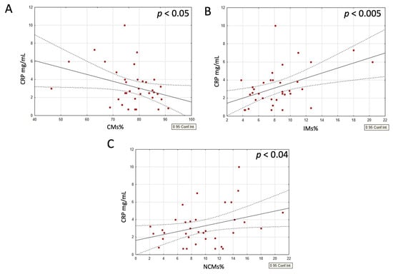 (A–C) Correlations between CRP and subsets of circulating monocytes in all participants. (A) Correlation between CRP and CMs, (B) CRP and IMs, and (C) CRP and NCMs. p-values were obtained through simple linear regression analysis, with the following results: (A) p < 0.05; (B) p < 0.005; (C) p < 0.04.