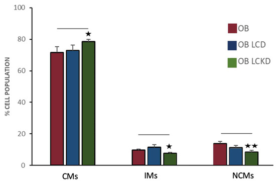 In contrast, after 4 weeks of a LCD, the distribution of circulating monocyte subsets (CMs: 72.73 ± 3.17%; IMs: 11.08 ± 1.76%; NCMs: 11.06 ± 1.34%) did not show significant differences (p = 0.414, p = 0.207, and p = 0.089, respectively) compared to individuals with obesity who did not undergo dietary restrictions (Figure 5).