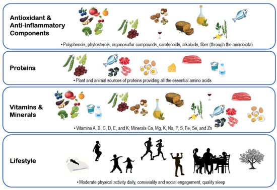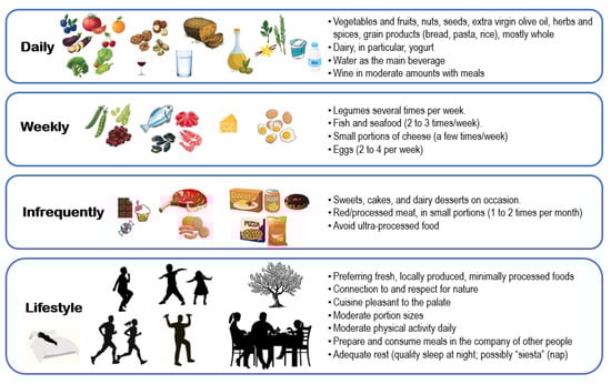 The traditional Mediterranean diet is characterized by high consumption of vegetables, fruits, legumes, whole grains, and nuts; generous consumption of healthy fats from olive oil, commonly used in cooked vegetables, legumes, and salads; moderate-to-high consumption of sea products (fish and shellfish); and moderate consumption of fermented dairy products [37,45]. Consuming large amounts of fruits and vegetables, which are low in calories but rich in nutrients and fiber, supports long-term adherence to this healthy and high-quality diet, ensuring nutritional adequacy without the need for taking supplements [46]. The inclusion of extra virgin olive oil and various aromatic herbs enhances the flavor of plant-based dishes, making it easier to maintain a high intake of fresh, flavorful vegetables [47]. The traditional Mediterranean diet emphasizes two crucial elements: a high ratio of monounsaturated to saturated fats, primarily due to the use of olive oil as the main or sole cooking fat, and high consumption of unprocessed or minimally processed plant-based foods, including fruits, vegetables, nuts, and legumes [45]. Figure 1 illustrates the recommended daily/weekly consumption for foods and combinations contained in the Mediterranean diet and non-nutritional components of this high-quality dietary and lifestyle model based on references [37,43,45]. It includes the consumption of a variety of fresh vegetables and fruits two to three times a day; two to four tablespoons of olive oil daily, serving as the primary (and almost sole) source of dietary fat for seasoning and cooking; and nuts and seeds as snacks, preferably daily. The consumption of legumes is recommended several times per week. Whole grains should be consumed daily, and fish and seafood should be eaten two to three times a week. Dairy, particularly yogurt, is encouraged, with small portions of cheese consumed less frequently. Eggs are included in the diet at a rate of two to four per week. Herbs and spices are used regularly to season meals. Sweets, as well as red and processed meats, should be eaten infrequently, typically once a week or less. Water is the main beverage used in the Mediterranean diet, while wine may be consumed in small amounts, always with meals if not contradictory to religious and social norms or health conditions. Components of the Mediterranean diet not directly related to its nutrient composition include connection to and respect for nature; moderate portions; moderate physical activity daily; and preparing and consuming meals in the company of other people (e.g., family and friends). It also comprises having adequate rest (sufficient and quality sleep at night; possibly short periods of rest during the day as a “siesta” = nap); preference for fresh, locally produced foods that have undergone minimal industrial processes; and cuisine pleasant to the palate [37,43,45].