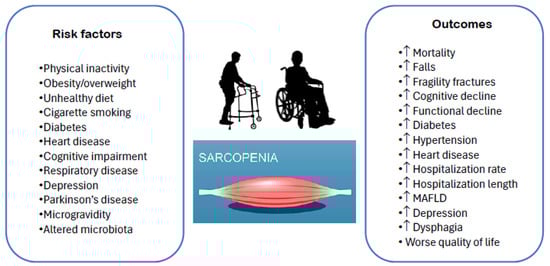 Sarcopenia is characterized by a gradual decline in muscle mass, strength, and function, which results in reduced physical performance, a higher risk of falls, fractures, functional deterioration, frailty, and mortality [11,13]. Sarcopenia also represents a significant healthcare burden, in particular regarding the estimated cost of hospitalizations in persons with sarcopenia [65] worsened by the co-presence of frailty [66]. While it primarily affects older adults, sarcopenia can also develop in mid-life [11] and is particularly common in specific populations, including persons affected by cancer [67,68], diabetes [69], liver disease [70], and kidney dysfunction [71]. Additionally, sarcopenia serves as a significant prognostic factor for survival and clinical complications in these patient groups [67,68,69,70,71]. A number of risk factors and health outcomes, such as those included in Figure 2, have been reported to be associated with sarcopenia. A recent review summarized the findings from 109 studies on the consequences and 25 studies on the risk factors of sarcopenia [72] involving patients with highly diverse characteristics. Overall, the authors found that sarcopenia was associated with an increased risk of mortality, cognitive decline, falls and fractures, hospitalization rate, functional decline, metabolic syndrome and diabetes, non-alcoholic fatty liver disease, depression, hypertension, and dysphagia. However, the risks for the diverse outcomes were highly variable considering the moderate to high heterogeneity among the studies; some associations had large confidence intervals due to the small sample sizes involved, while some others were retrospective, where the measurement error of sarcopenia made the results uncertain. Moreover, the associations might have been significantly affected by the diverse definitions of sarcopenia used and variations in muscle mass measurements, which limited the comparability of these associations [72].