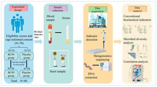 A total of 72 participants were recruited for screening in this study, with 70 eligible participants. Among them, 60 participants completed the entire experimental process. As shown in Figure 1, 70 eligible participants were randomly assigned into a placebo group or a probiotic group (35 participants in each group). Participants in the placebo group were daily treated with placebo (composed of 3 g maltodextrin) intervention, while participants in the probiotic group were daily treated with Weizmannia coagulans BC99 (3 g, 1 × 1010 CFU) probiotic intervention. The total duration of the study was 60 days, and participants were followed up and sampled on day 1 and day 60, respectively. During the intervention period, participants in each group were required to take the corresponding products daily and record any adverse reactions. After the intervention period was completed, the remaining products and empty packaging boxes were all recovered.