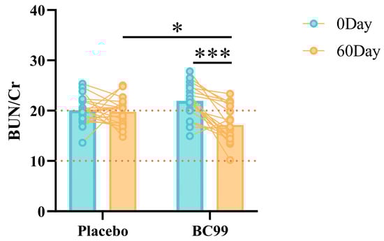 The regulatory effect of Weizmannia coagulans BC99 on “BUN (mg/dL)/Cr (mg/dL)”. The conversion relationship between different units refers to Beeler []. * p < 0.05, *** p < 0.001. The two red dashed lines represent the range of clinical normal values for this indicator.