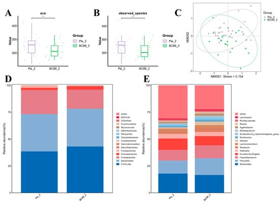 BC99 regulated the composition of gut microbiota. (A) ace indice; (B) observed indice; (C) NMDS analysis; (D) abundance of phylum-level flora; (E) abundance of genus-level flora. Pla_2 and BC99_2 represented samples from the placebo group and BC99 group after 60 days of intervention, respectively. * p < 0.05.