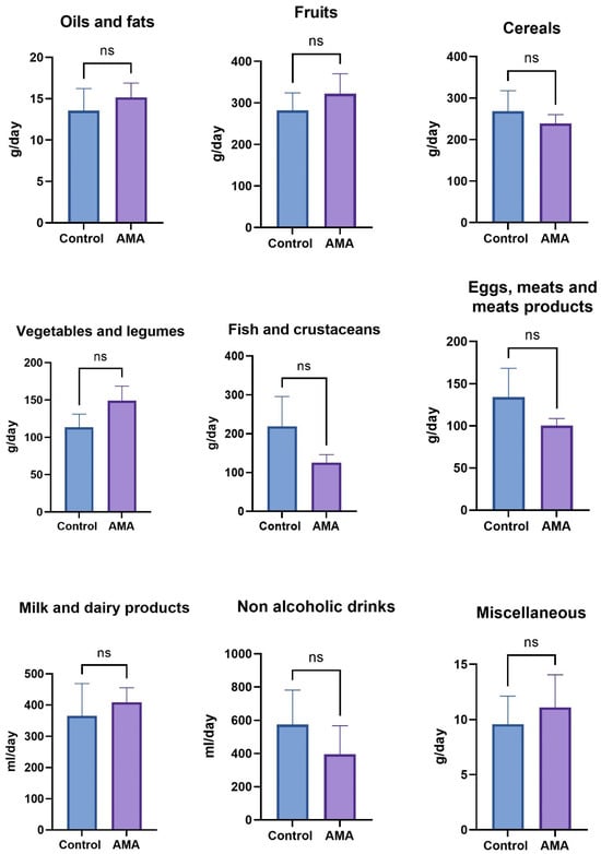 AMA: advanced maternal age; ns: not significant. Comparison between control and AMA at groups of food level, assessed by a food frequency questionnaire.