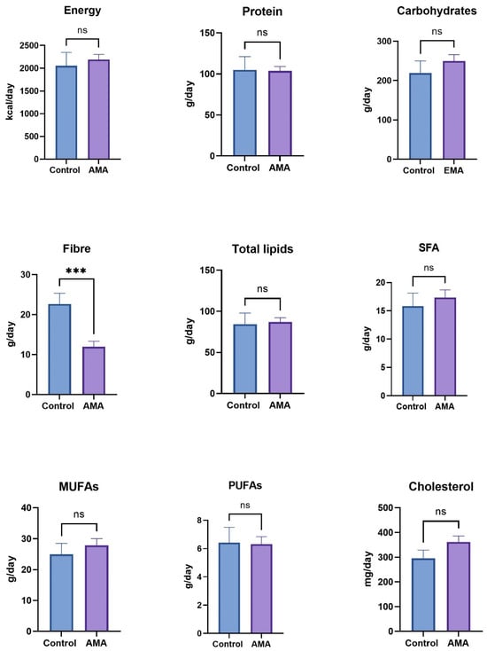 No statistically significant differences were found in terms of total energy, as well as in the total macronutrients. Likewise, when differentiating by type of fat, no statistically significant differences were shown. Fiber consumption, however, was significantly lower in comparison with the control group (22.65 ± 2.6 g/day for the control group and 11.95 ± 1.38 g/day for the AMA group; p < 0.05). Differences in the intake of macronutrients, as well as type of fat and fiber, are shown in Figure 2.