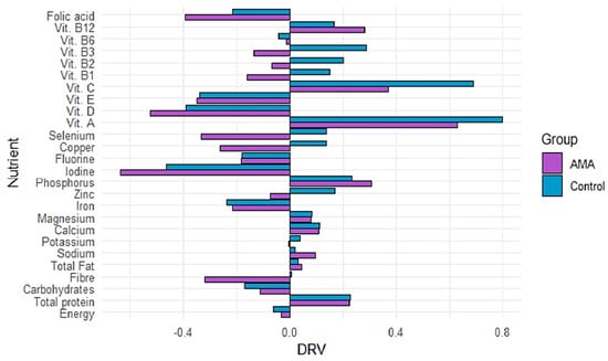 Figure 3 shows a comparison between the intake of nutrients estimated by the FFQ and the DRVs indicated by the AESAN. For most of the nutrients, it is observable that the AMA group is far below the recommendations for minerals like zinc, copper and selenium and vitamins from complex B such as B1, B2 and B3. There are other nutrients like carbohydrates, iron, iodine, fluorine, vitamin D, vitamin E and folic acid which are below the DRVs in both groups.
