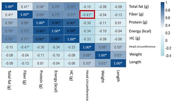 Correlations between energy and macronutrients, including fiber, and anthropometric measures of the newborn (* p < 0.05, in red square).