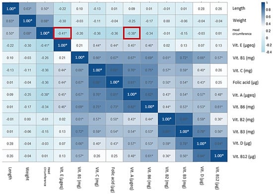 Correlations between vitamins and anthropometric measures of the newborn (* p < 0.05, in red square).