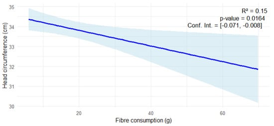 The nutrients that were significantly correlated (p < 0.05) with any of the anthropometric measures of the newborn were transformed in a multivariable stepwise regression model as candidate predictors of any of the measures. As shown in Figure 6, consumption of fiber during gestation could be a predictor factor for head circumference with an estimation rate of −0.037.