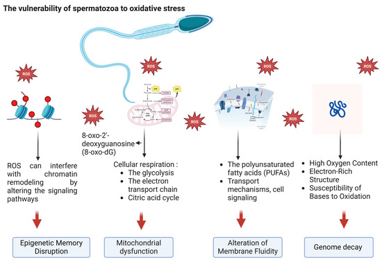 The male reproductive system, particularly sperm cells, is highly susceptible to oxidative stress due to the presence of polyunsaturated fatty acids (PUFAs) in sperm membranes, negatively affecting sperm motility and viability. Additionally, the high metabolic activity of sperm cells, which depends on oxidative phosphorylation and glycolysis for energy production, leads to the generation of ROS as byproducts. The limited antioxidant defenses in the testes and semen, such as superoxide dismutase, catalase, and glutathione, exacerbate oxidative damage, as their levels may be insufficient to effectively counteract excessive ROS production [27,28].
