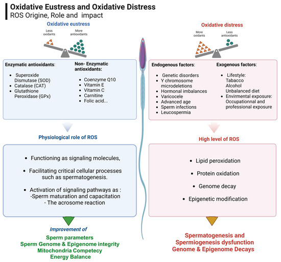 Figure 2. The sources of ROS, their role in spermatozoa function according to the oxidant/antioxidant imbalance, and the contribution of antioxidants to the male reproductive system.