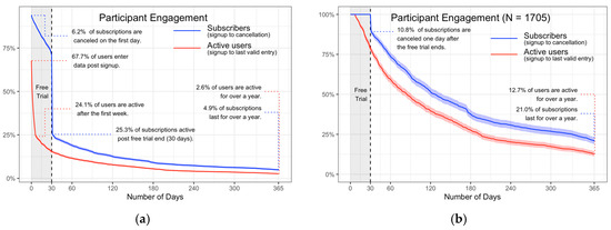 IWL program platform engagement: (a) platform engagement for the total dataset; (b) platform engagement for those subscribing past the free trial period.