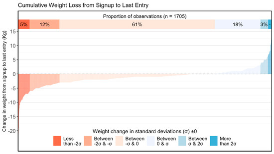 In total, 1411 participants recorded waist measurements; the median number of days active for those reporting waist measurements was 57 days (IQR 23,162), and the median number of measures was 4 days (IQR 2,10). Figure 3 details the weight change distribution in a waterfall plot: 78% of subscribers lost weight, with 61% having a loss between 3.16 kg (1 SD) and 0 kg.