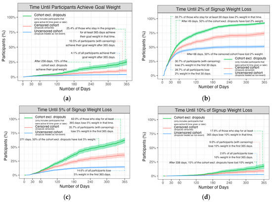 Survival analysis with dropouts censored (in orange) and the two sensitivity analyses where dropouts are excluded after their last weight entry (green) and an analysis where dropouts remain in the dataset with their last recorded weight carried forward. The analysis examined the following: (a) Time until participants achieve goal weight; (b) Time until participants achieve 2% weight loss; (c) Time until participants achieve 5% weight loss; (d) Time until participants achieve 10% weight loss. Only participants in the program after the free trial period are included.