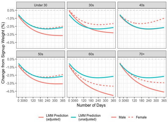 Predicted change in weight from sign-up (%) to 365 days adjusted for age and sex from the linear mixed model with polynomial regression (order = 5).