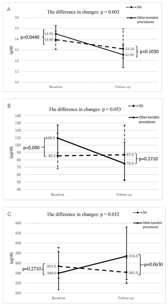 Regarding the prevalence of anemia, it is notable that the incidence was higher among patients who had undergone bariatric procedures other than SG as their first surgery. It is crucial to consider the significant discrepancies in group sizes when interpreting these findings. The decrease in median hemoglobin and iron levels was significantly higher in the other bariatric surgery group. This highlights the importance of monitoring iron metabolism to pre-empt potential complications over time.