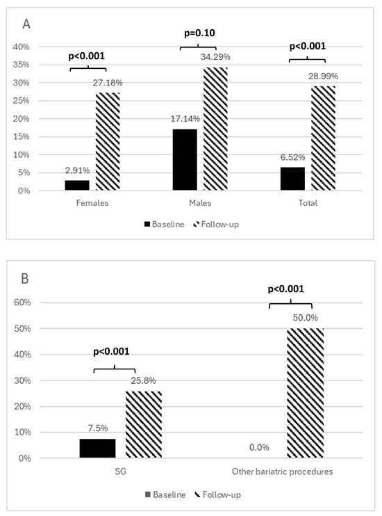 The median observation period was 10 years [10 years–11 years]. The observation period was similar in females and males (10 [10,11] years vs. 10 [9,10,11] years, p = 0.51), as well as in the SG group and the other bariatric procedures group (10 [10,11,12] years vs. 10 [9,10] years, p = 0.077).
