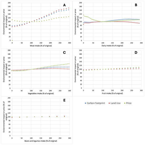 In addition to carbon footprint and land use, the impact of dietary changes on price was also evaluated. From Figure 1, it is clear that none of the scenarios evaluated caused a substantial reduction in price. The only slight reductions in price were observed in decreasing the levels of vegetables (Figure 1C) and fruit (Figure 1D) in the diets. Changes in levels of beans and legumes did not affect the price at all (Figure 1E) whereas for meat (Figure 1A) and particularly for dairy (Figure 1B), the base diet showed the lowest price, and both decreases and increases the levels of these product categories resulted in the increased price of the diet. For dairy products, Figure 1B shows that their omission from the diets resulted in a diet that was >35% more expensive. This can be related to the fact that the products required to replace the nutrient gaps arising from the removal of dairy are more expensive.